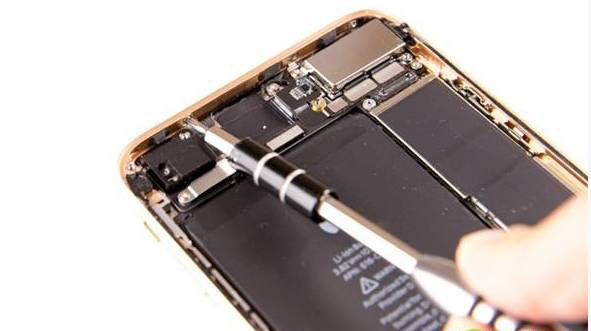 我们来一起了解这款手机的分布,在屏幕组里有17颗螺丝,有两颗比较重要的螺丝是用来固定整个手机是模型的,底部的Touch ID键有4颗螺丝固定,在顶部的听筒传感器上需要5颗螺丝固定,在金属隔层盖的板上有6颗螺丝用来固定。