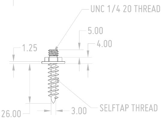 我们从上至下开始看, 上右标注的是螺纹螺距的要求,1/4 20的牙距,往下的5mm数据指的是六角与上方的长度,再往下的4mm指的是圆形加六角的厚度,再左边的1.25mm的数据指的是圆形的厚度,那么我们就知道,六角螺母的厚度为2.75.