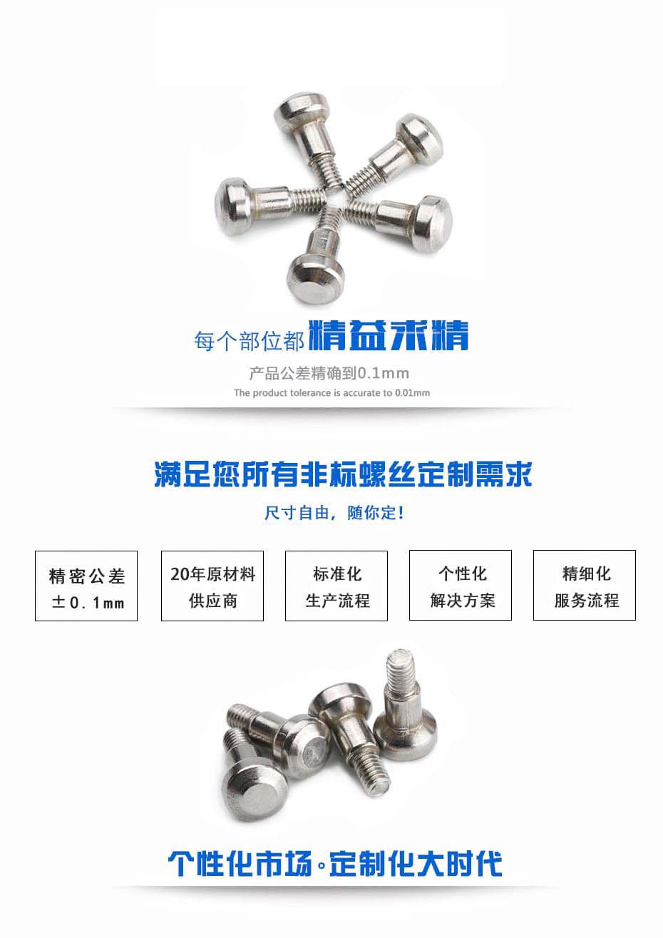 这款不锈钢异形螺丝采用了优质的304不锈钢,304不锈钢螺丝的延展性能好,而且具有防锈,耐腐蚀的性能,且不经任何的表面处理,不锈钢异形螺丝的表面呈现出的是银白色,外观光亮如新,再加上具有防锈的性能,304不锈钢异形螺丝可以十年如新,在众多螺丝材料中,304不锈钢材料的应用是十分广泛的,深圳Special Screw China螺丝厂家生产的这款异形螺丝,螺丝的台阶头型都是根据用户的产品需要量身设计与定制的,可定制直径M1/M2/M3/M4/M5/M6/M7/M8等各种非标异形螺丝紧固件,如需要定制不锈钢异形螺丝,可直接拔打Special Screw China异形螺丝定制电话:136662281868