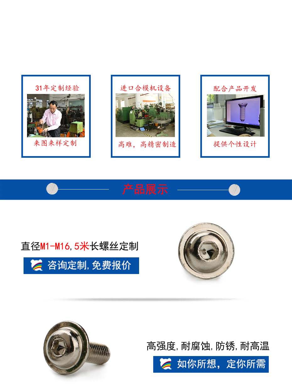产品详情:内六角圆头带介螺丝定制,可按要求定制M16以下,70mm以上的内六角圆头带介螺丝,超长螺丝,