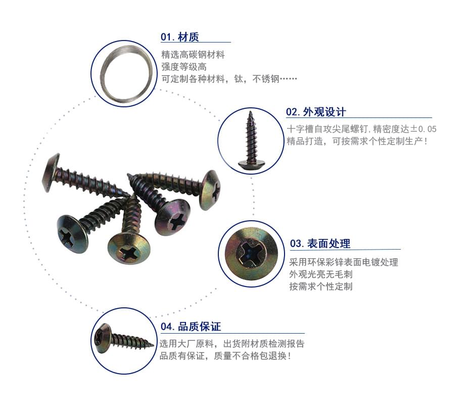 产品详情:十字槽PF头自攻尖尾螺丝采用高碳钢材料,强度等级高抗拉能力强,可按客户需求量身定制十字槽自攻尖尾螺丝